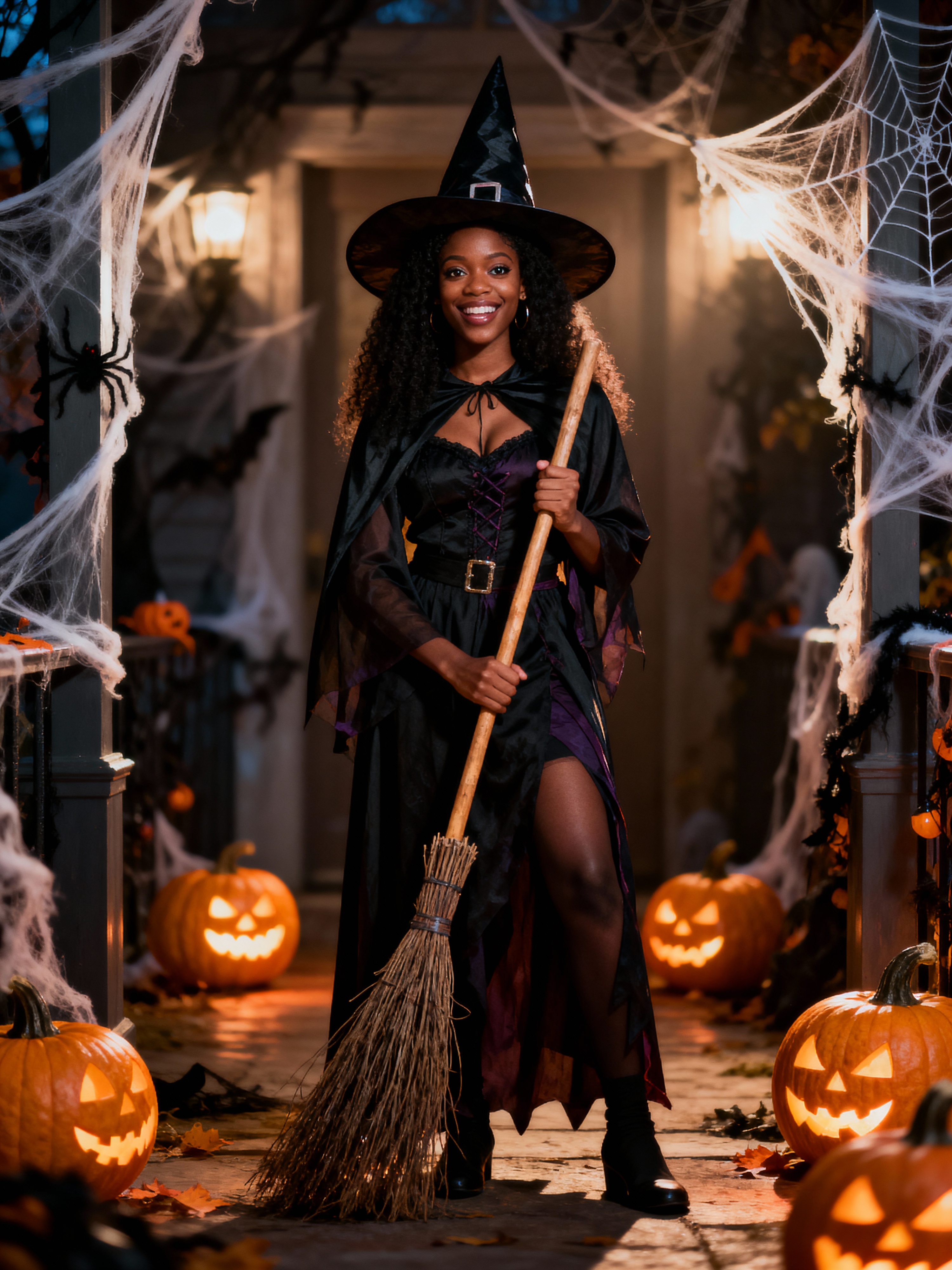 A model dressed as a friendly witch, wearing a pointed hat and holding a broomstick, surrounded by Halloween decorations like spider webs and glowing pumpkins.