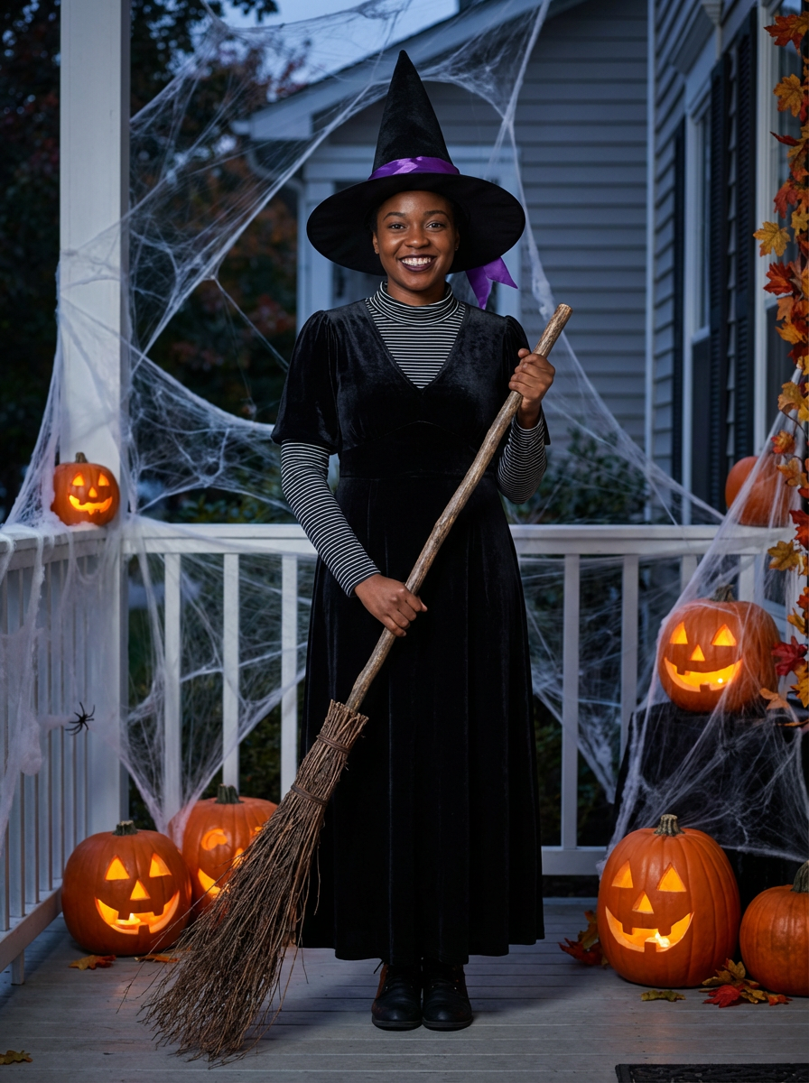 A model dressed as a friendly witch, wearing a pointed hat and holding a broomstick, surrounded by Halloween decorations like spider webs and glowing pumpkins.