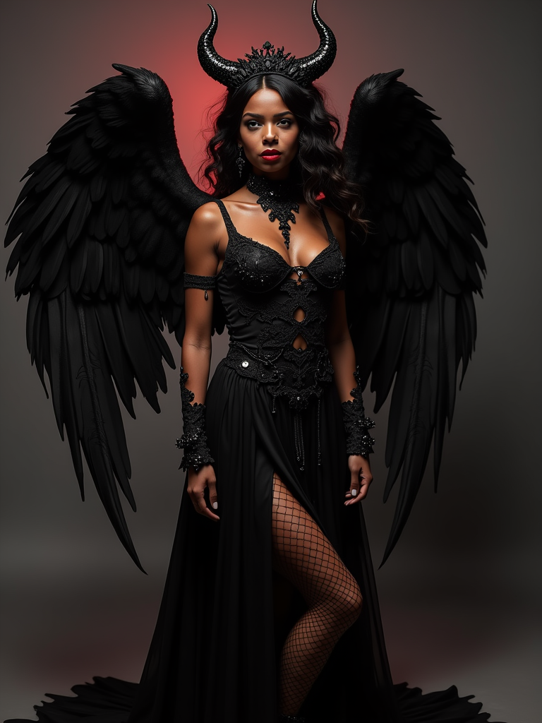 a model dressed as an angel poses for a picture, dark angel, angel knight gothic girl, dark gothic dress, very sexy devil outfit, full body devil model, gothic model dressed in black and red, megan fox witch queen, raven winged female vampire, villainess has black angel wings, gothic outfit, tall female angel, gothic dress, fallen angel, winged model angel, fishnet stockings