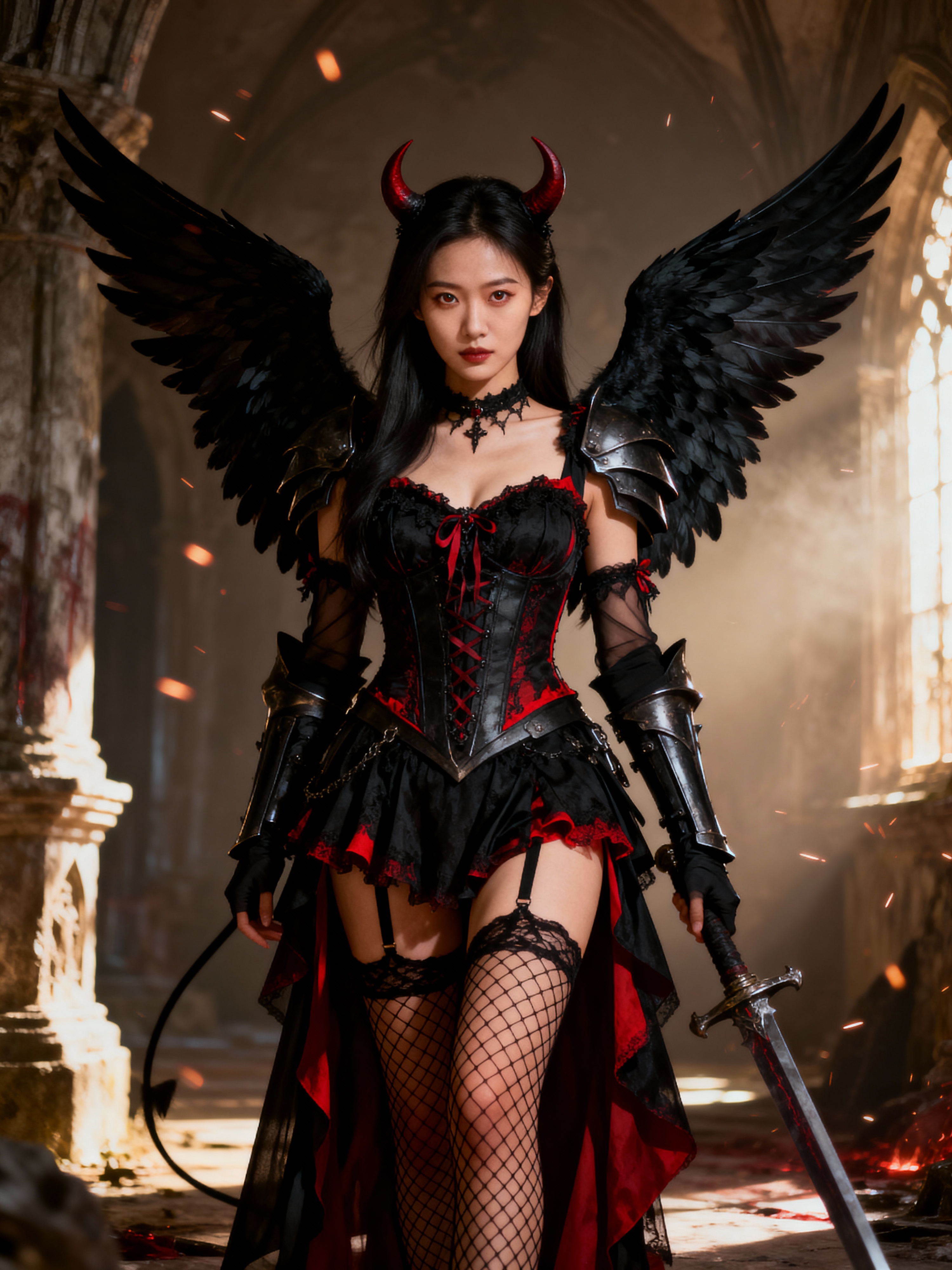 a model dressed as an angel poses for a picture, dark angel, angel knight gothic girl, dark gothic dress, very sexy devil outfit, full body devil model, gothic model dressed in black and red, megan fox witch queen, raven winged female vampire, villainess has black angel wings, gothic outfit, tall female angel, gothic dress, fallen angel, winged model angel, fishnet stockings