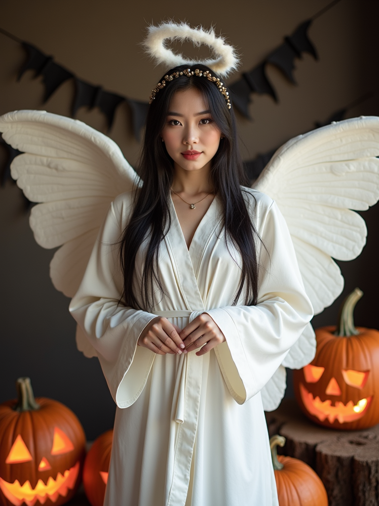 A model dressed as an angel, wearing a white robe with wings and a halo, posing against a Halloween backdrop with carved pumpkins and bats.