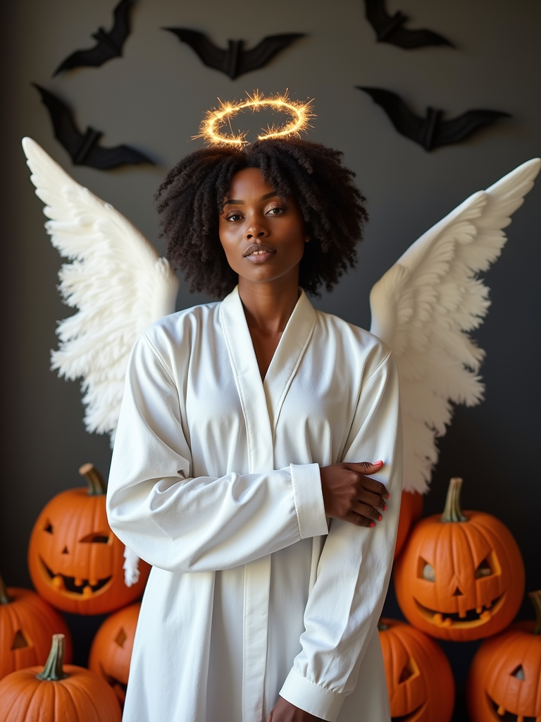 A model dressed as an angel, wearing a white robe with wings and a halo, posing against a Halloween backdrop with carved pumpkins and bats.