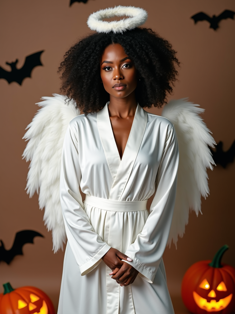 A model dressed as an angel, wearing a white robe with wings and a halo, posing against a Halloween backdrop with carved pumpkins and bats.