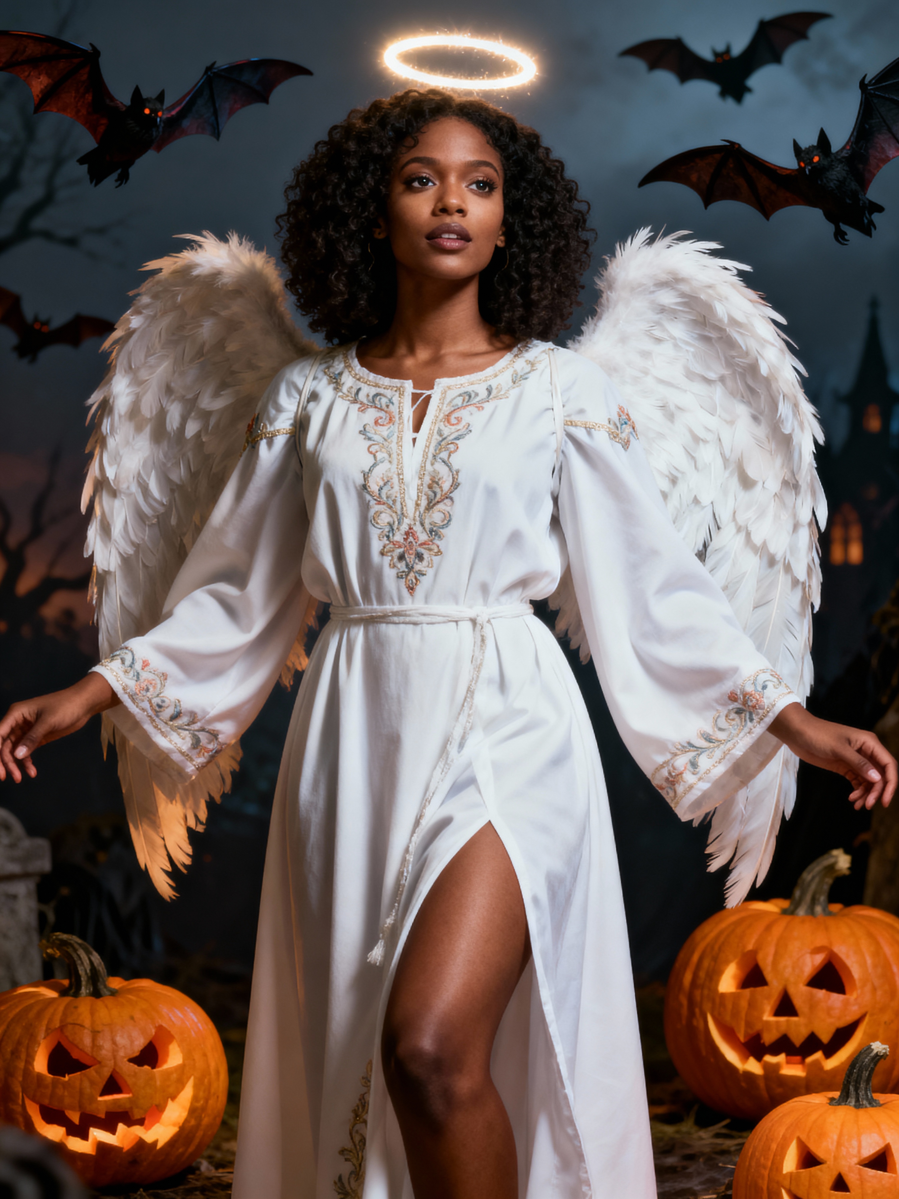 A model dressed as an angel, wearing a white robe with wings and a halo, posing against a Halloween backdrop with carved pumpkins and bats.
