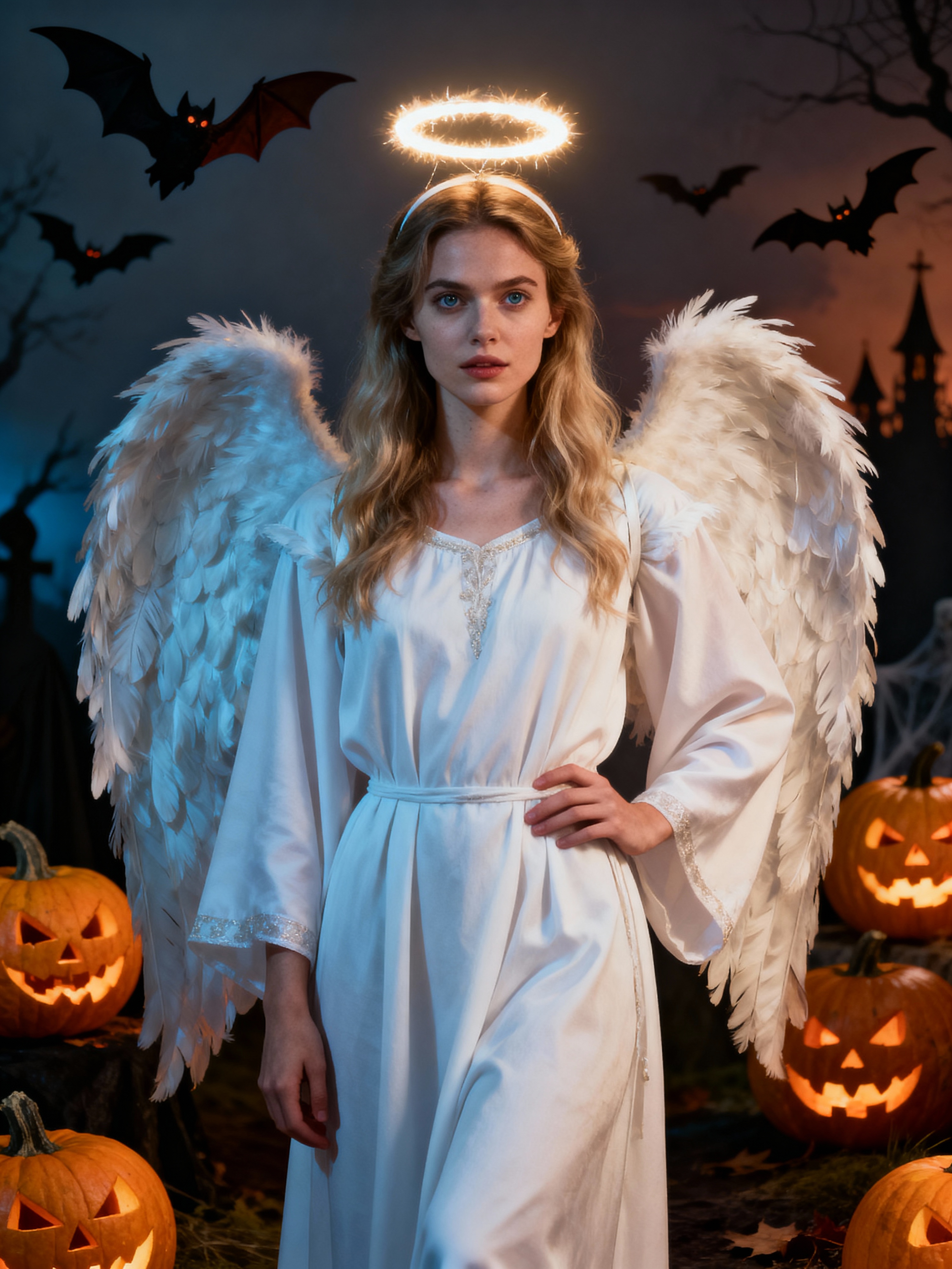 A model dressed as an angel, wearing a white robe with wings and a halo, posing against a Halloween backdrop with carved pumpkins and bats.