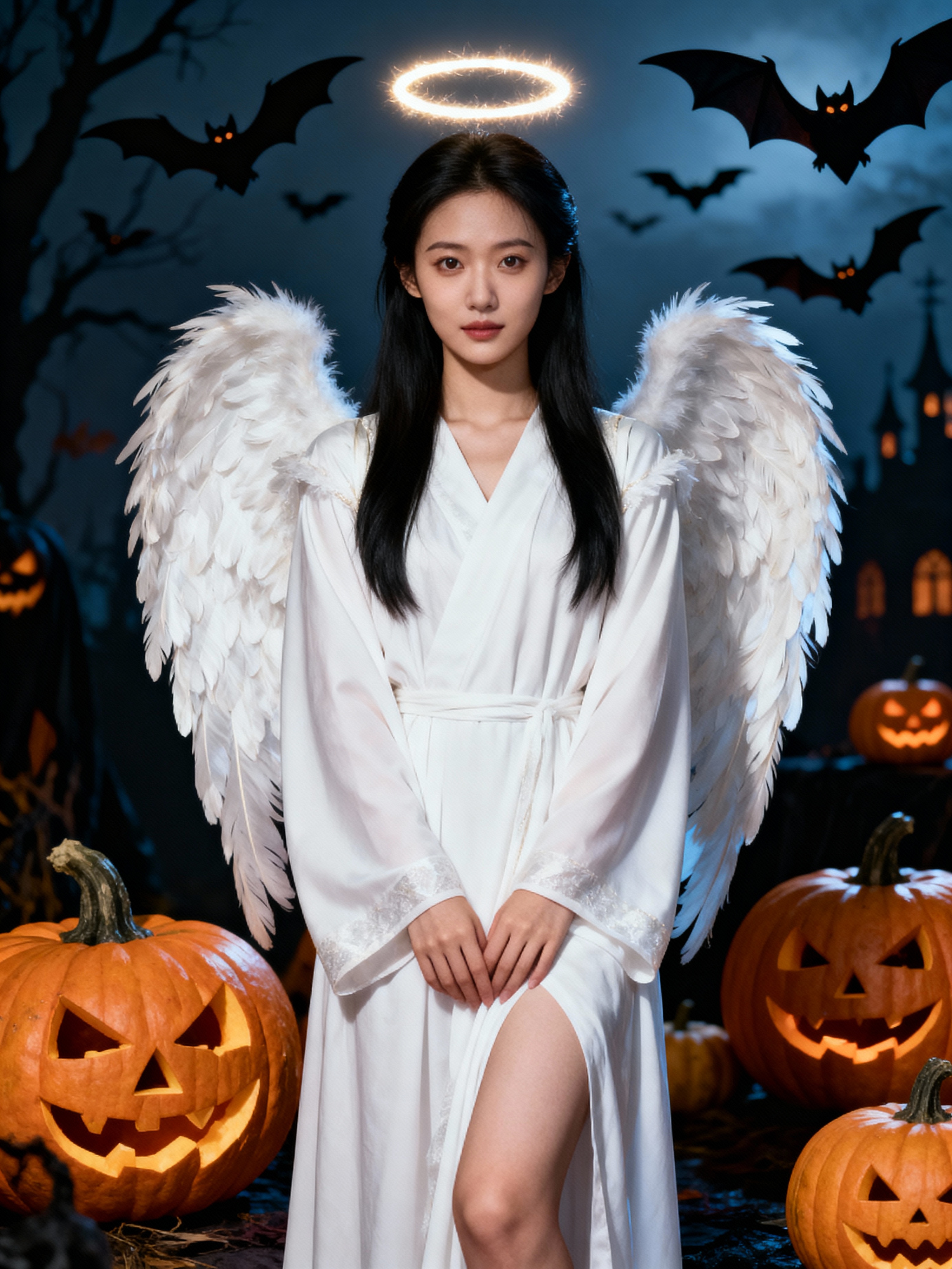 A model dressed as an angel, wearing a white robe with wings and a halo, posing against a Halloween backdrop with carved pumpkins and bats.