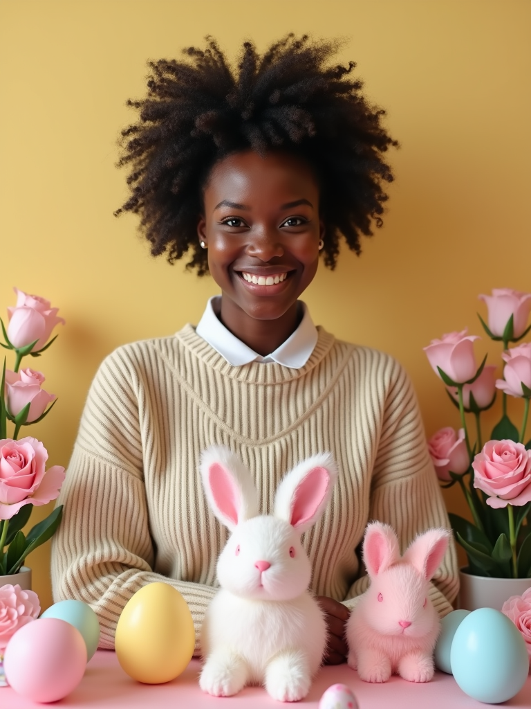 A model dressed in a casual spring outfit, surrounded by pastel Easter decorations like eggs, flowers, and bunnies.