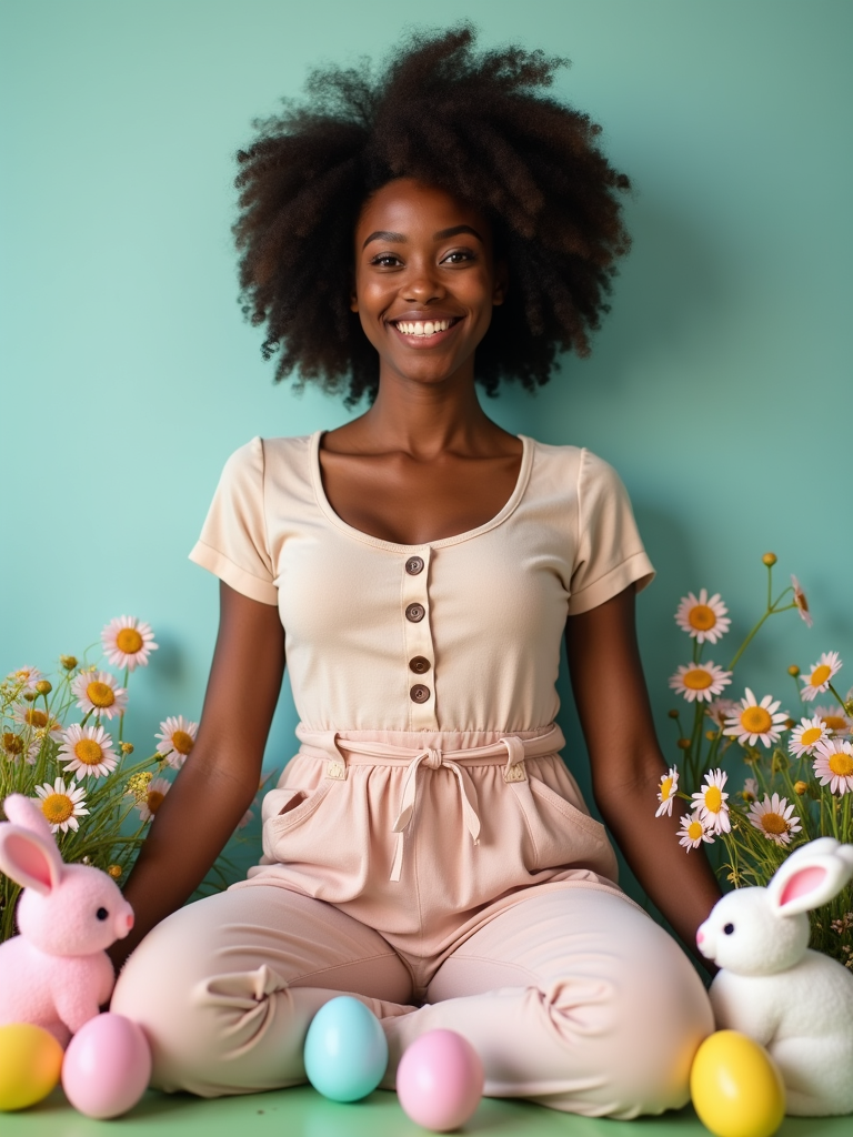 A model dressed in a casual spring outfit, surrounded by pastel Easter decorations like eggs, flowers, and bunnies.