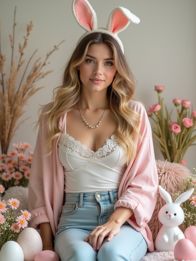 A model dressed in a casual spring outfit, surrounded by pastel Easter decorations like eggs, flowers, and bunnies.