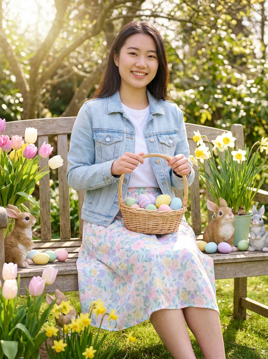 A model dressed in a casual spring outfit, surrounded by pastel Easter decorations like eggs, flowers, and bunnies.