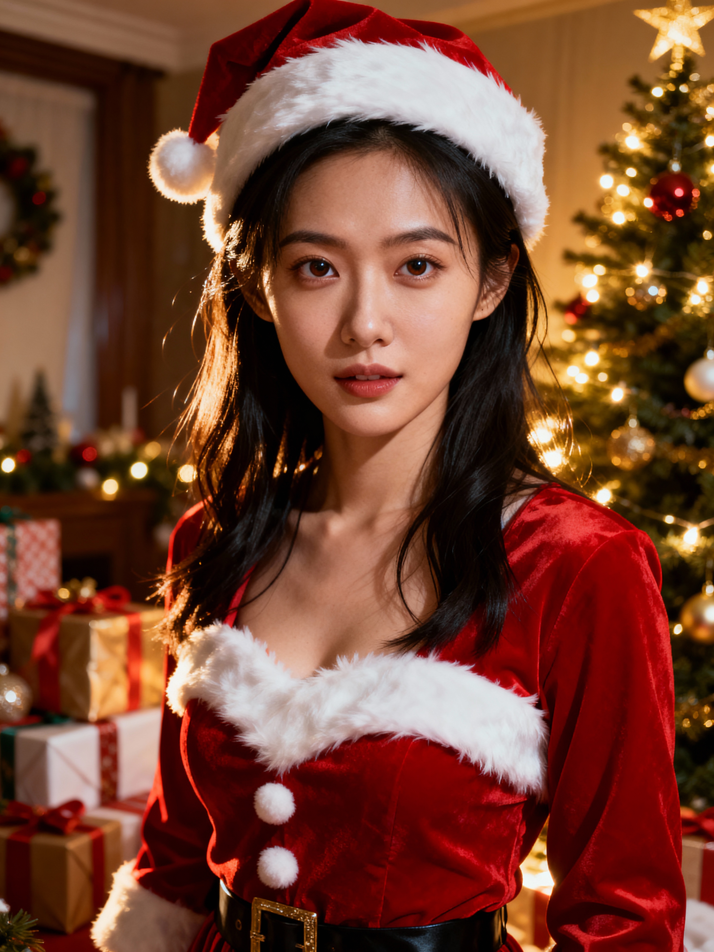 A model dressed in a classic Santa costume, standing in a room filled with holiday decorations, presents, and a Christmas tree.