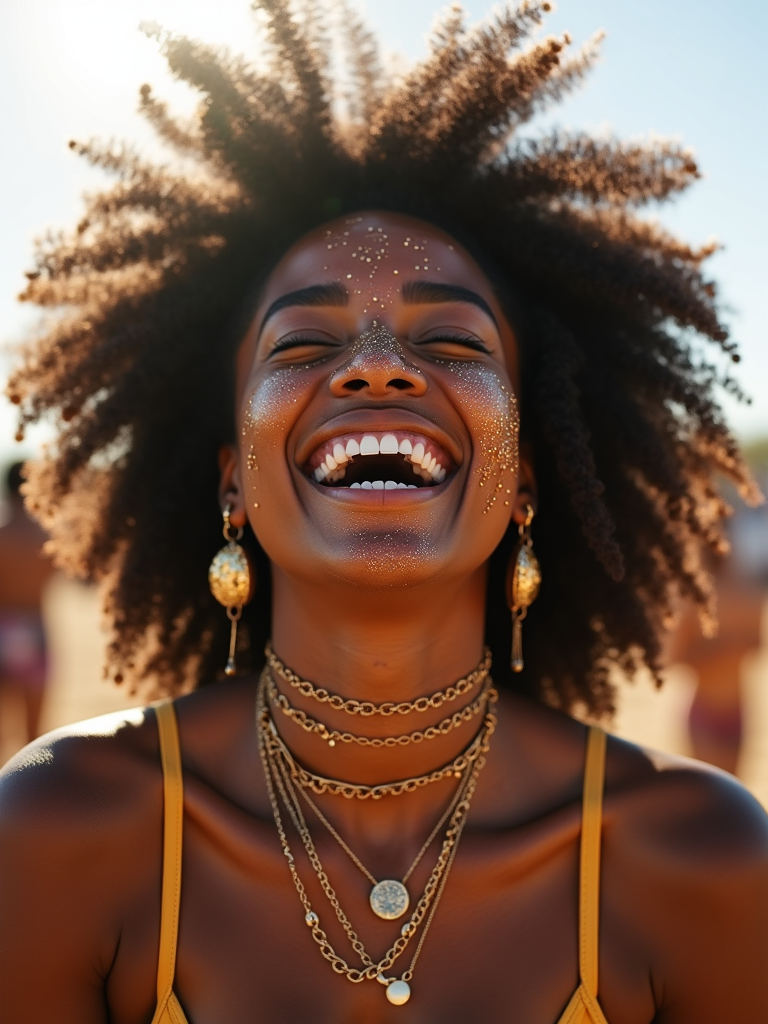 a model enjoying a performance at Coachella on a hot desert day, with glitter on their face , radiating joy under the California sun