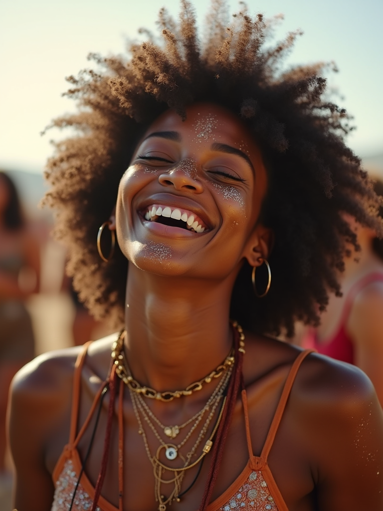 a model enjoying a performance at Coachella on a hot desert day, with glitter on their face , radiating joy under the California sun