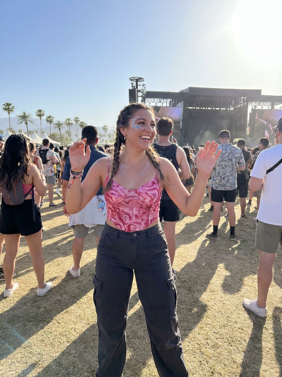 a model enjoying a performance at Coachella on a hot desert day, with glitter on their face , radiating joy under the California sun