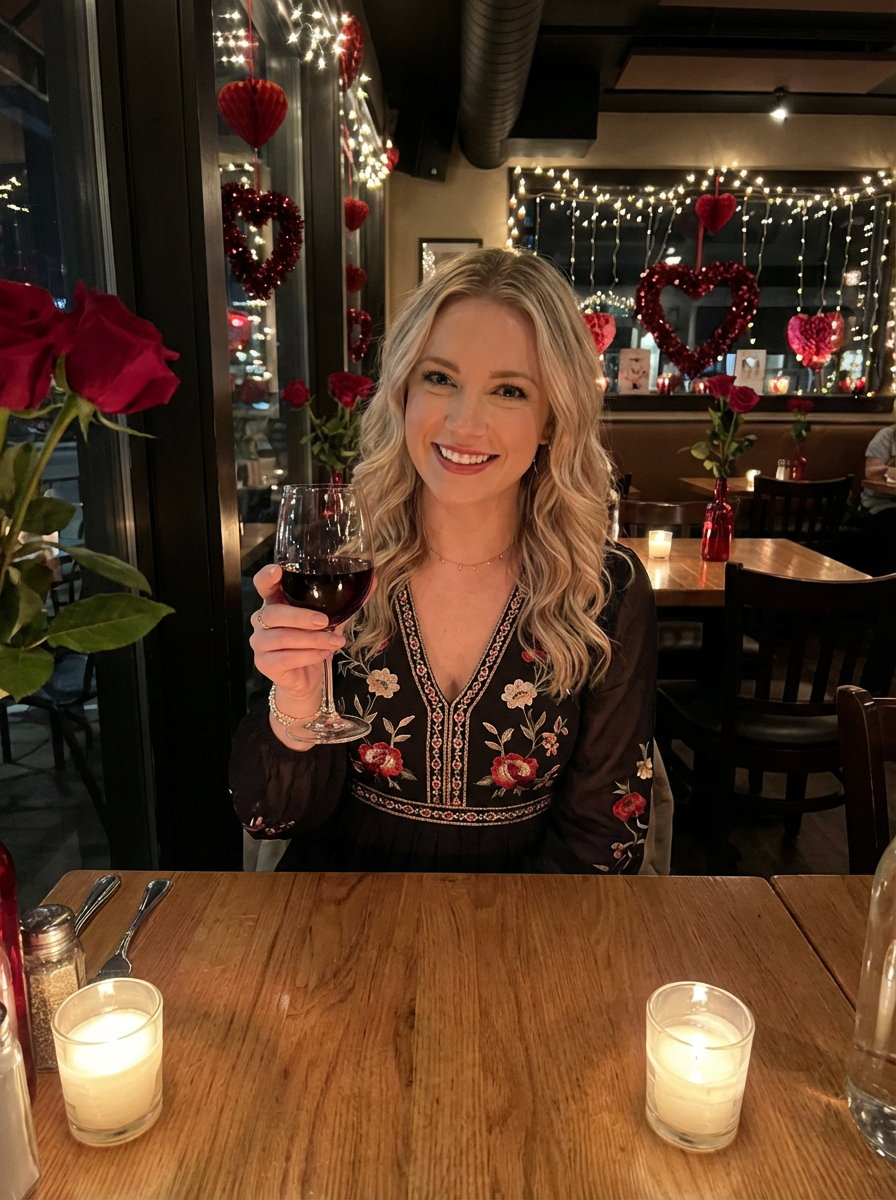 A model enjoying a romantic dinner with candles and soft lighting, set in a warm, Valentine's-themed atmosphere.