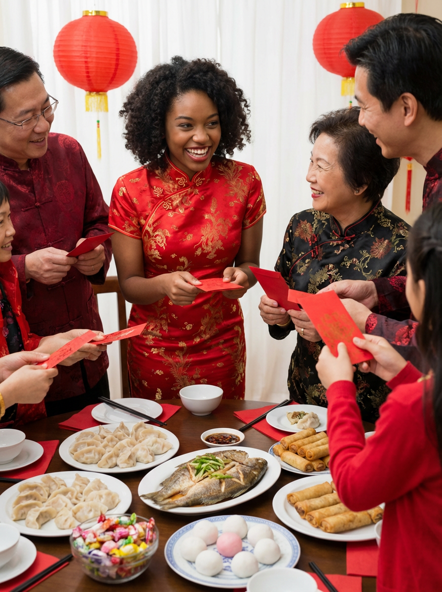 a model enjoying Chinese New Year festivities, surrounded by family members exchanging red envelopes , with a table full of symbolic foods and sweet treats