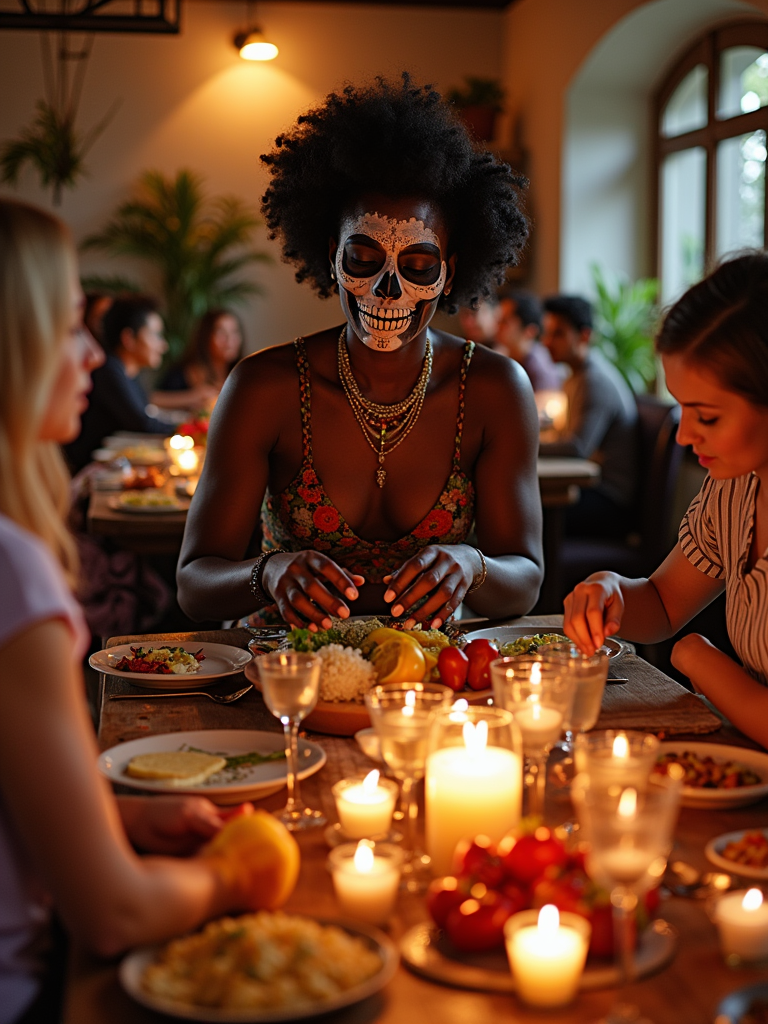 a model enjoying Day of the Dead festivities, surrounded by family members arranging ofrendas , with a table full of traditional foods and favorite dishes of the departed