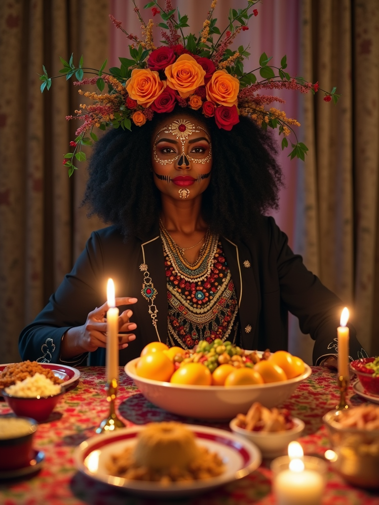 a model enjoying Day of the Dead festivities, surrounded by family members arranging ofrendas , with a table full of traditional foods and favorite dishes of the departed