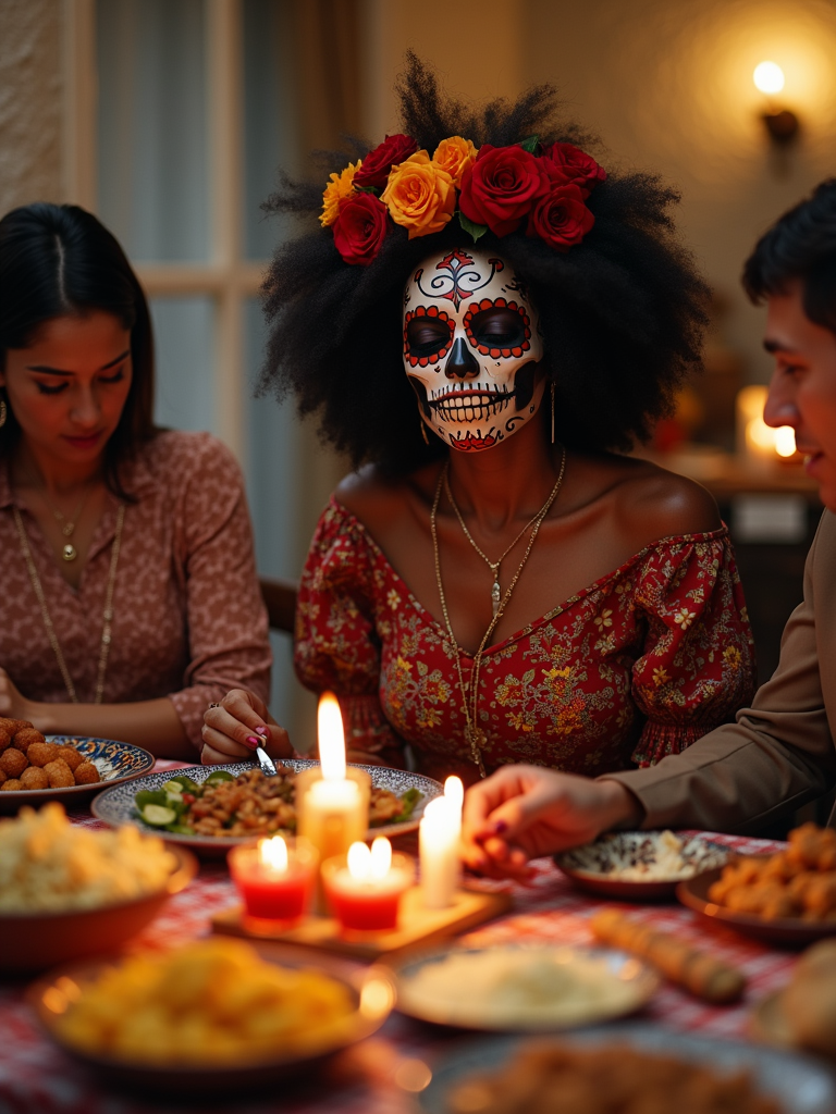a model enjoying Day of the Dead festivities, surrounded by family members arranging ofrendas , with a table full of traditional foods and favorite dishes of the departed