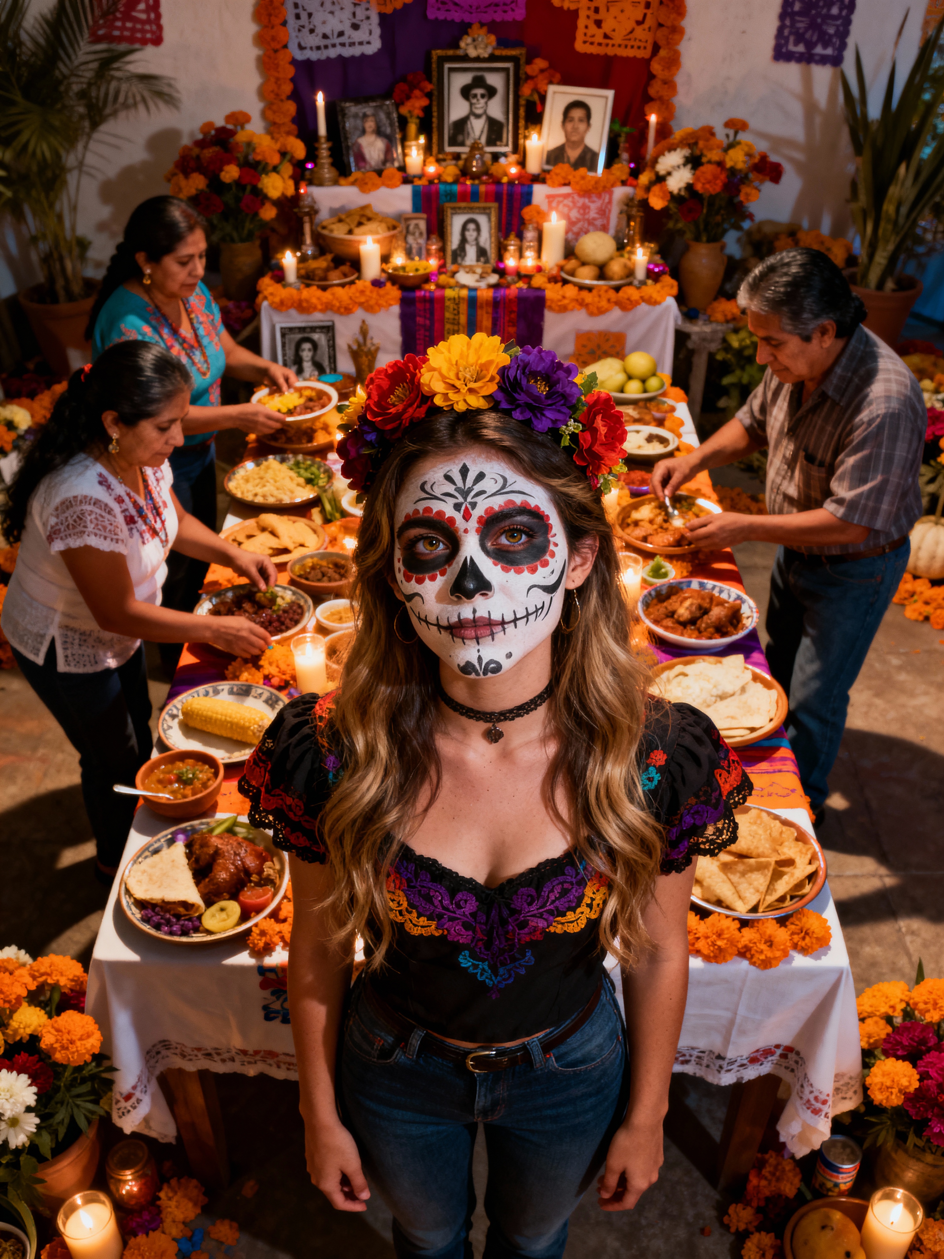 a model enjoying Day of the Dead festivities, surrounded by family members arranging ofrendas , with a table full of traditional foods and favorite dishes of the departed