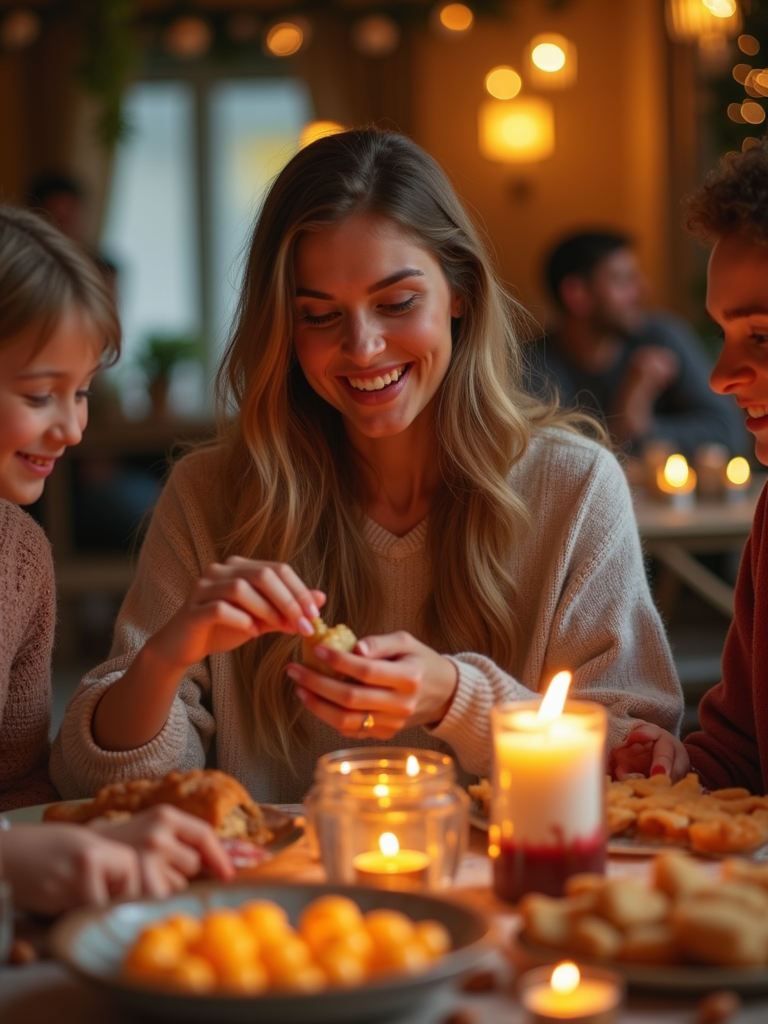 a model enjoying Eid festivities, surrounded by family members exchanging gifts , with a table full of traditional sweets and treats