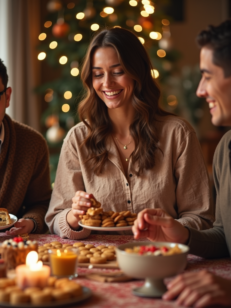 a model enjoying Eid festivities, surrounded by family members exchanging gifts , with a table full of traditional sweets and treats