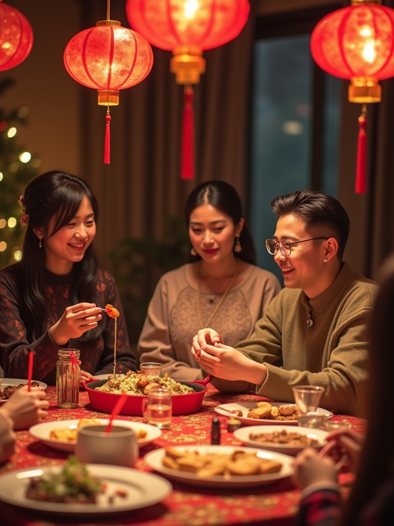 a model enjoying Eid festivities, surrounded by family members exchanging gifts , with a table full of traditional sweets and treats