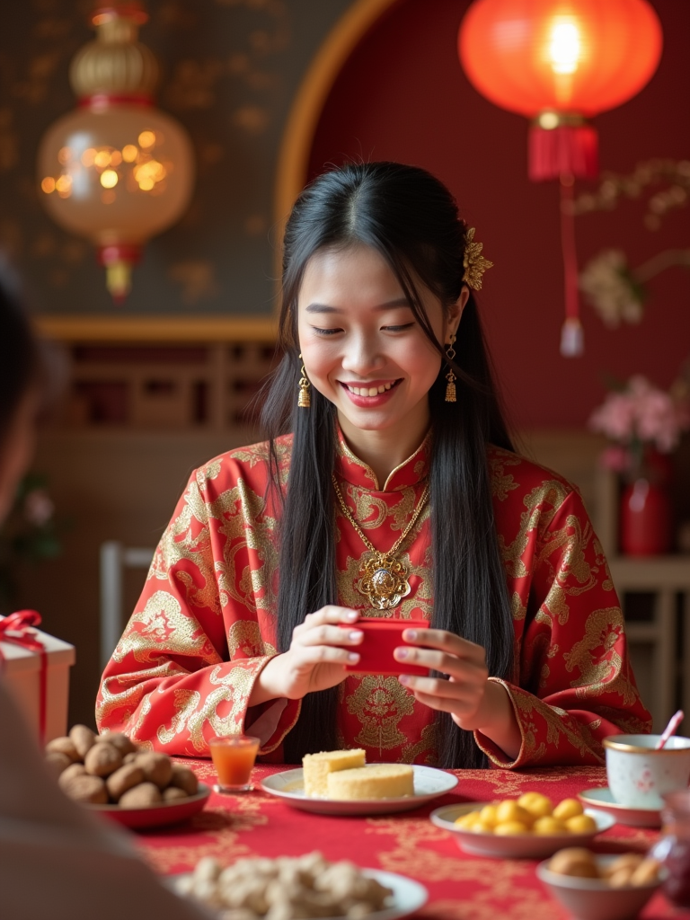 a model enjoying Eid festivities, surrounded by family members exchanging gifts , with a table full of traditional sweets and treats
