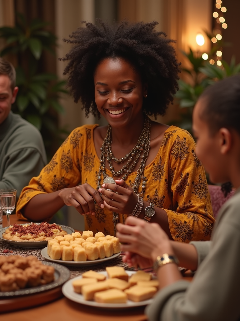 a model enjoying Eid festivities, surrounded by family members exchanging gifts , with a table full of traditional sweets and treats