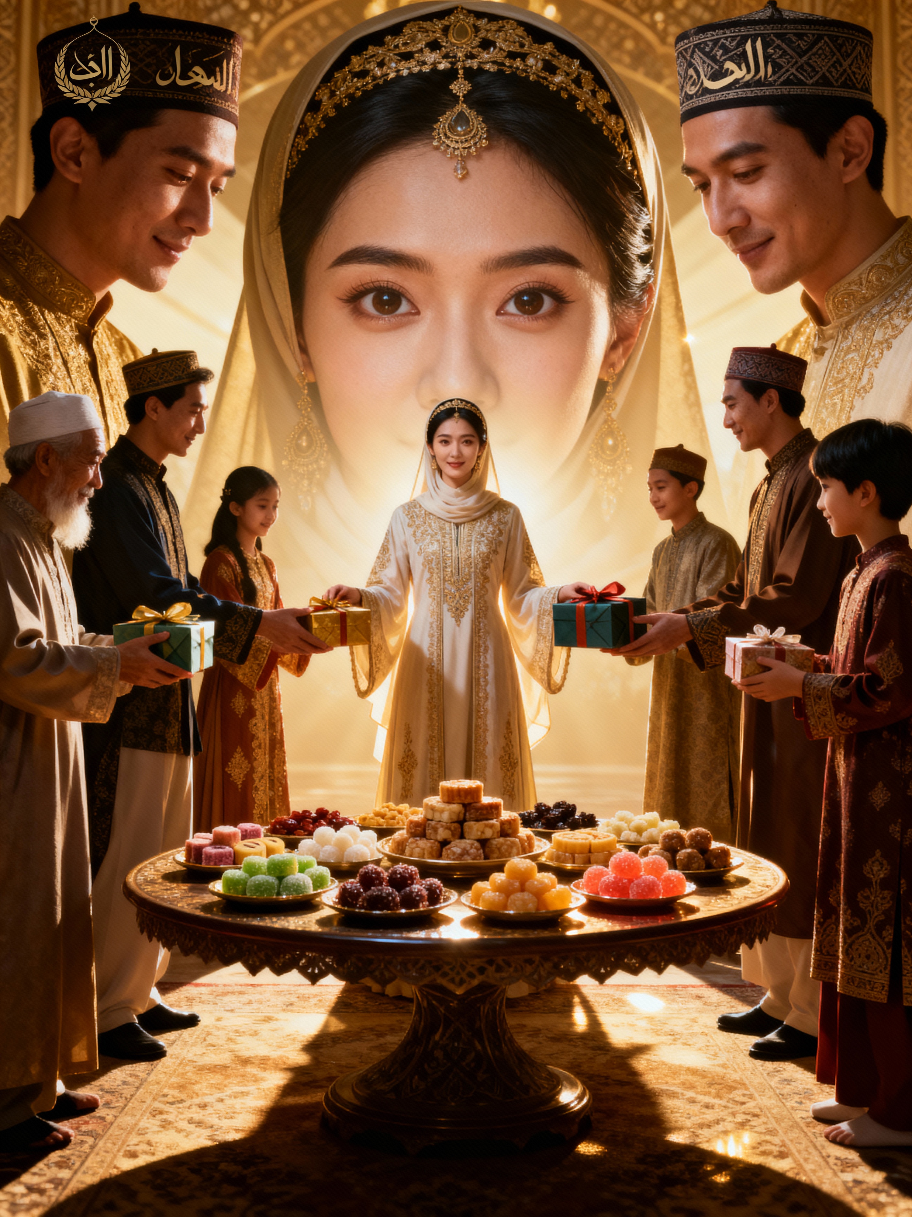 a model enjoying Eid festivities, surrounded by family members exchanging gifts , with a table full of traditional sweets and treats
