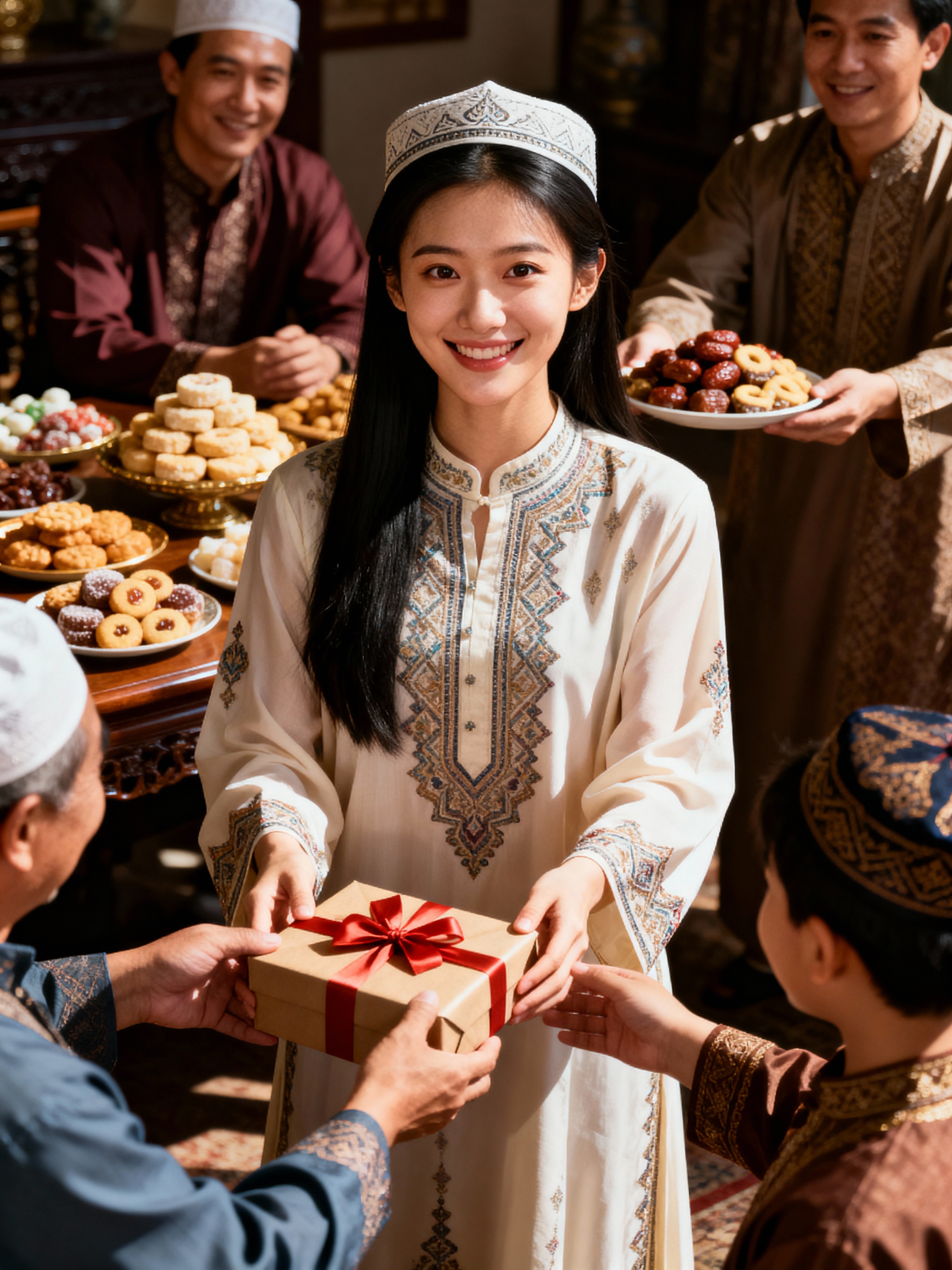 a model enjoying Eid festivities, surrounded by family members exchanging gifts , with a table full of traditional sweets and treats