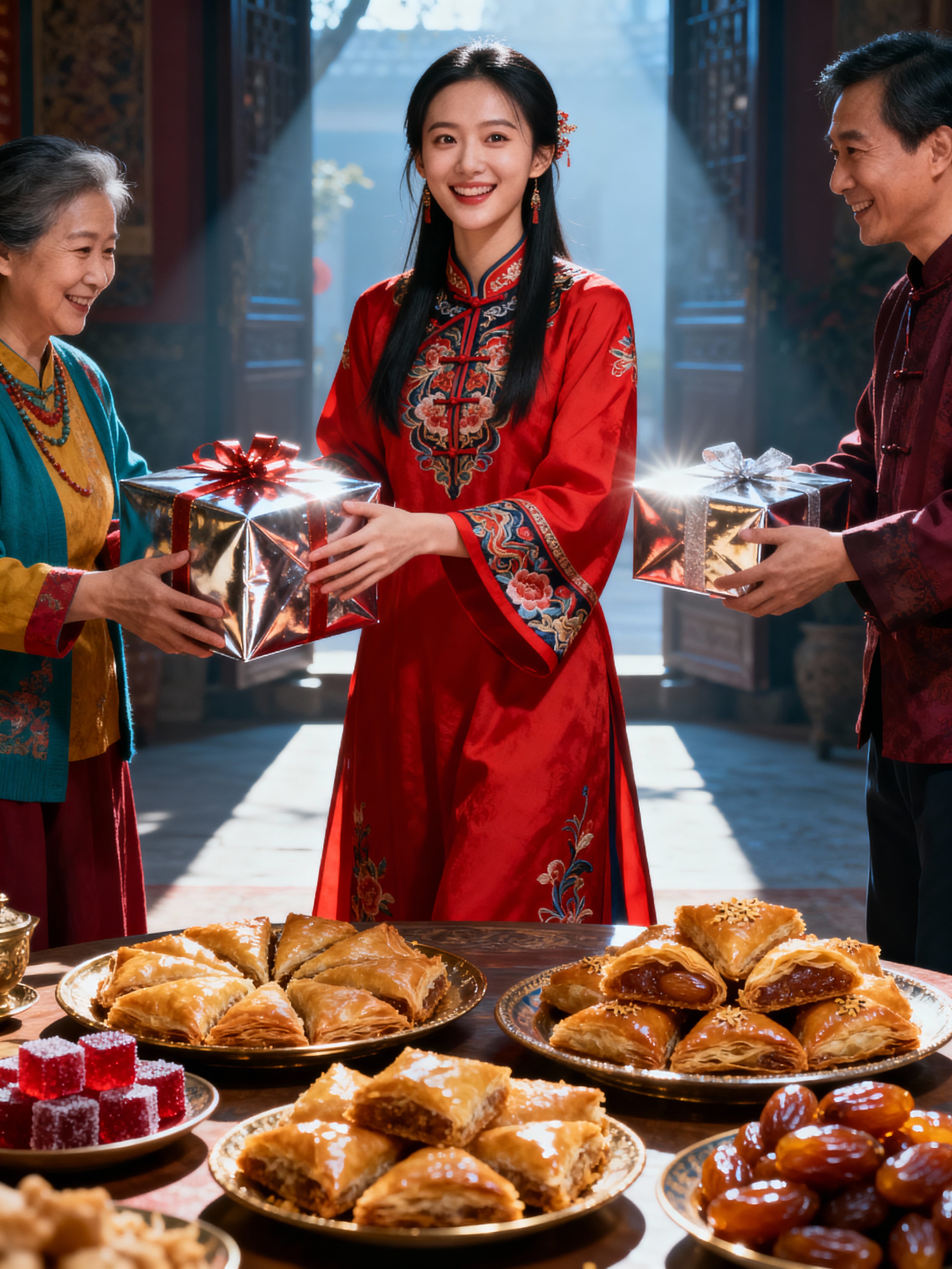 a model enjoying Eid festivities, surrounded by family members exchanging gifts , with a table full of traditional sweets and treats