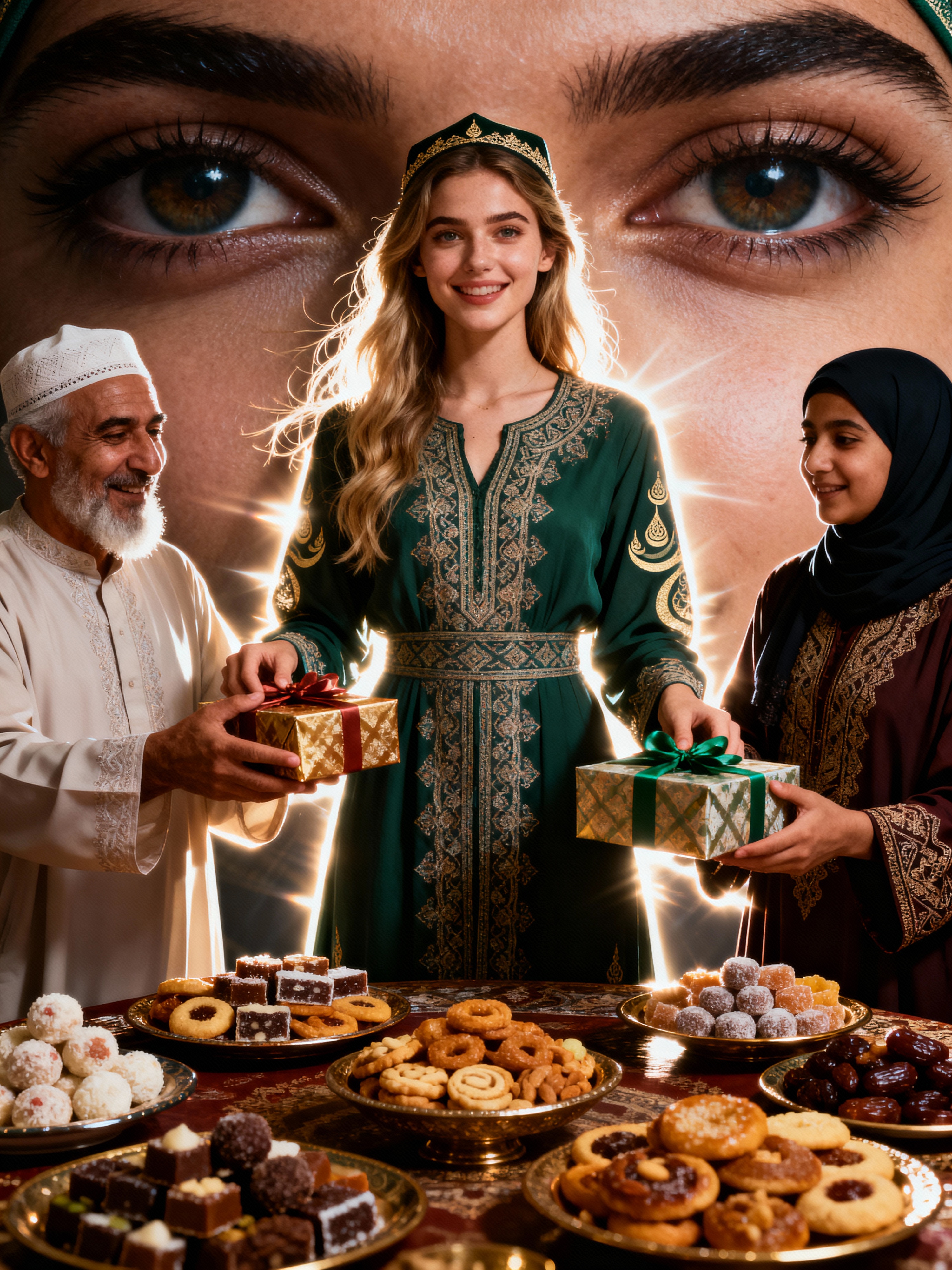 a model enjoying Eid festivities, surrounded by family members exchanging gifts , with a table full of traditional sweets and treats