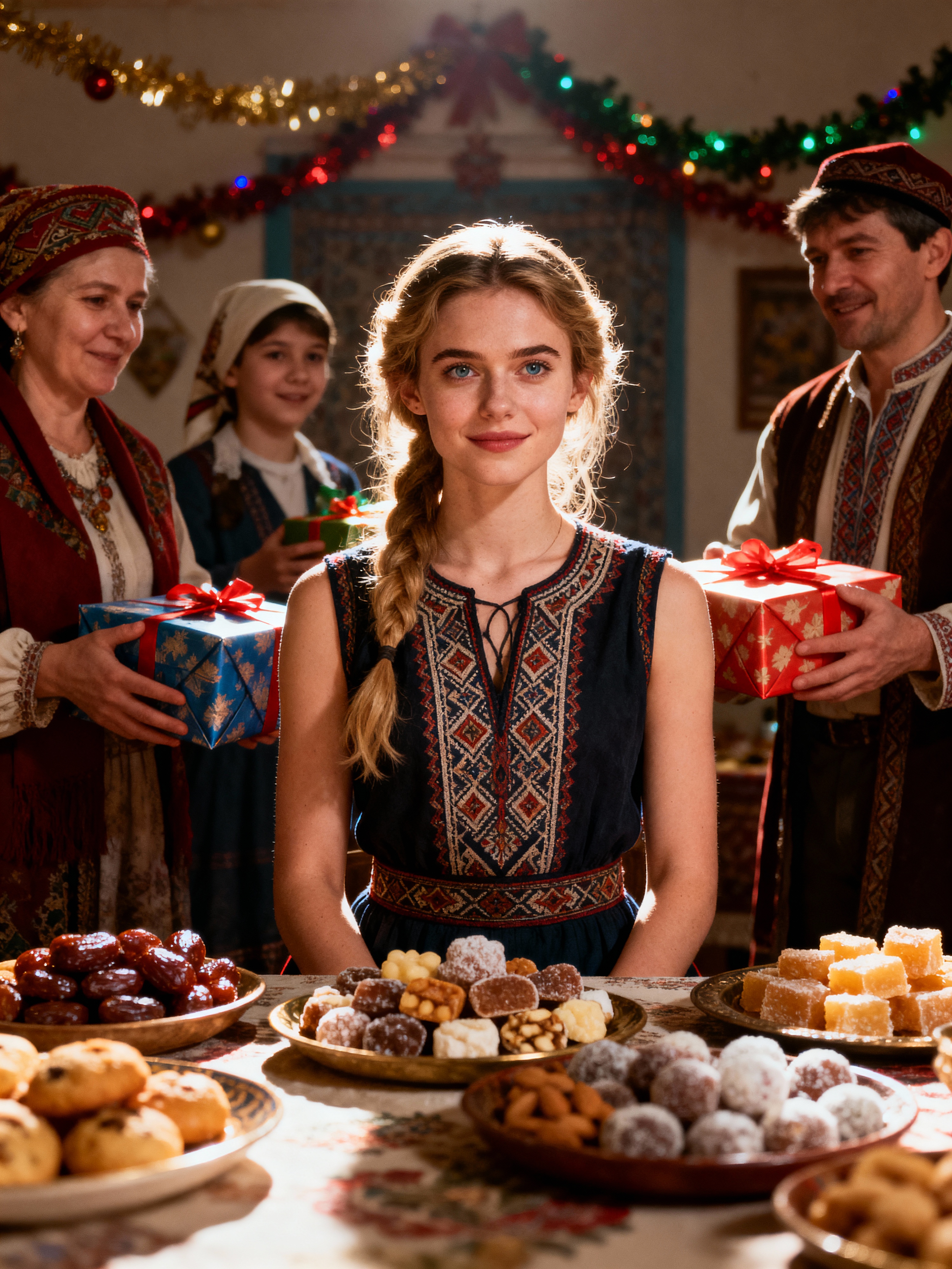 a model enjoying Eid festivities, surrounded by family members exchanging gifts , with a table full of traditional sweets and treats