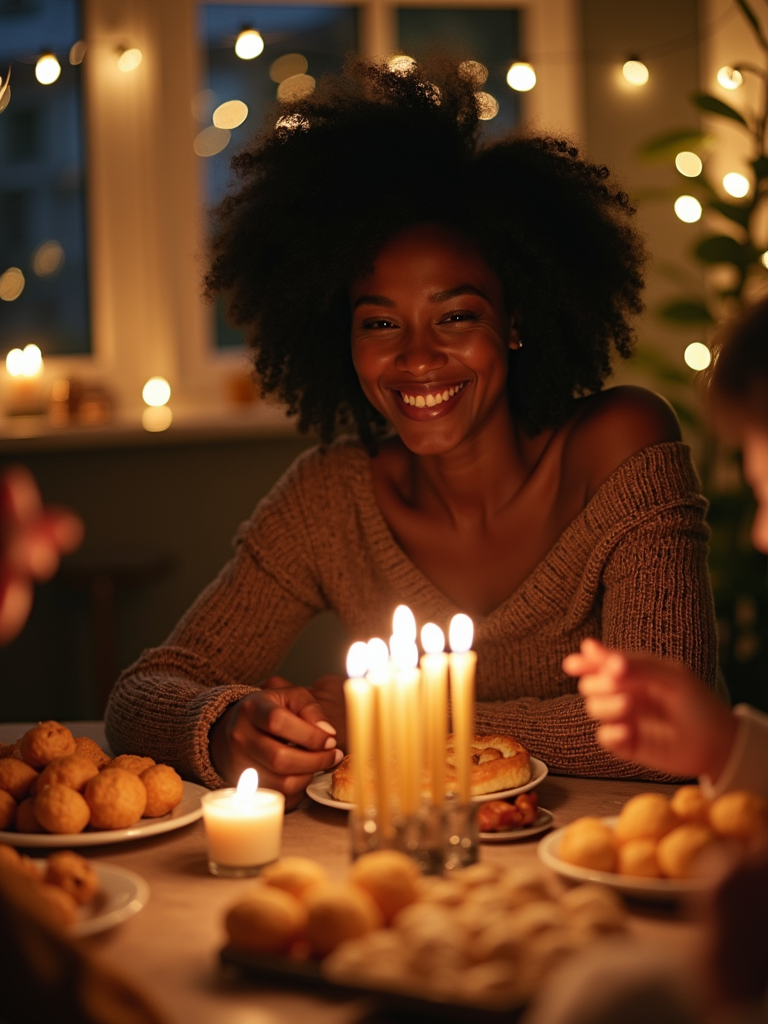 a model enjoying Hanukkah festivities in the evening, surrounded by family members playing dreidel , with a table full of traditional foods like latkes and sufganiyot