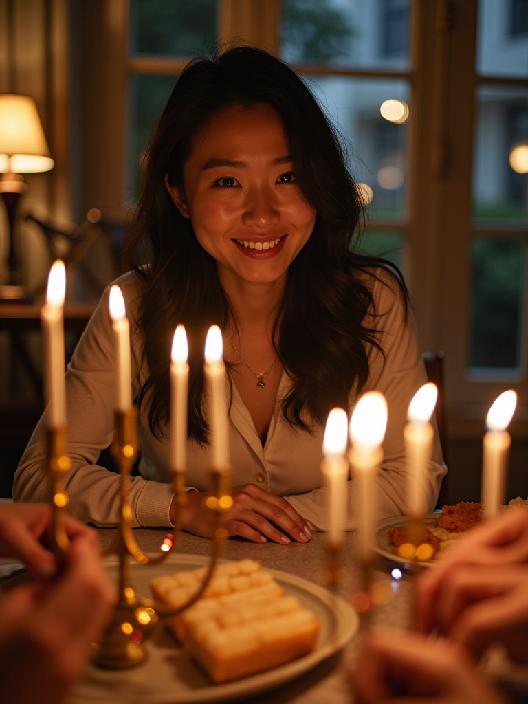 a model enjoying Hanukkah festivities in the evening, surrounded by family members playing dreidel , with a table full of traditional foods like latkes and sufganiyot