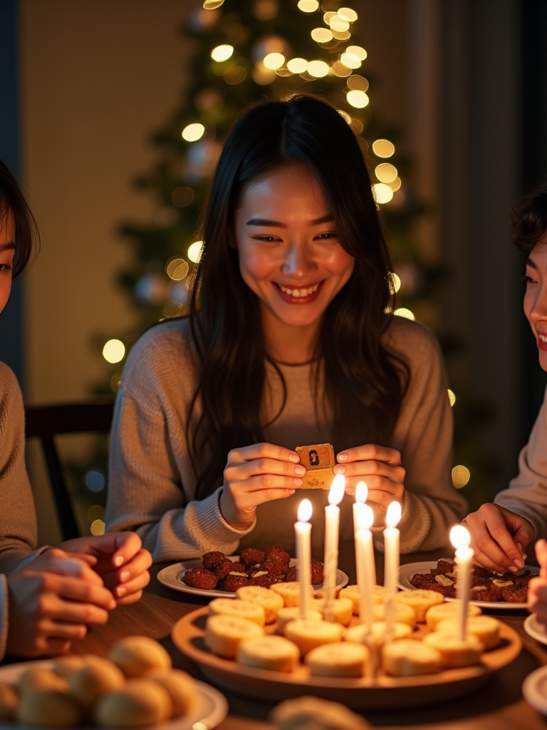 a model enjoying Hanukkah festivities in the evening, surrounded by family members playing dreidel , with a table full of traditional foods like latkes and sufganiyot