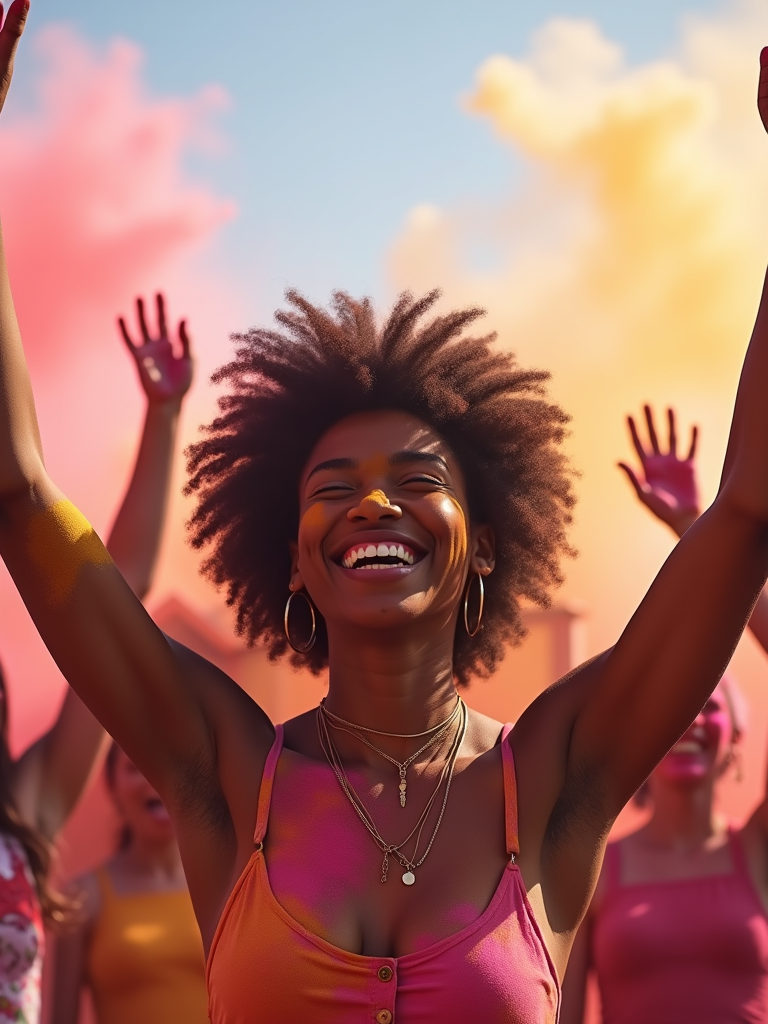 a model enjoying Holi festivities on a sunny day, surrounded by friends throwing gulal powder , raising their hands in celebration with multicolored powder clouds in the air