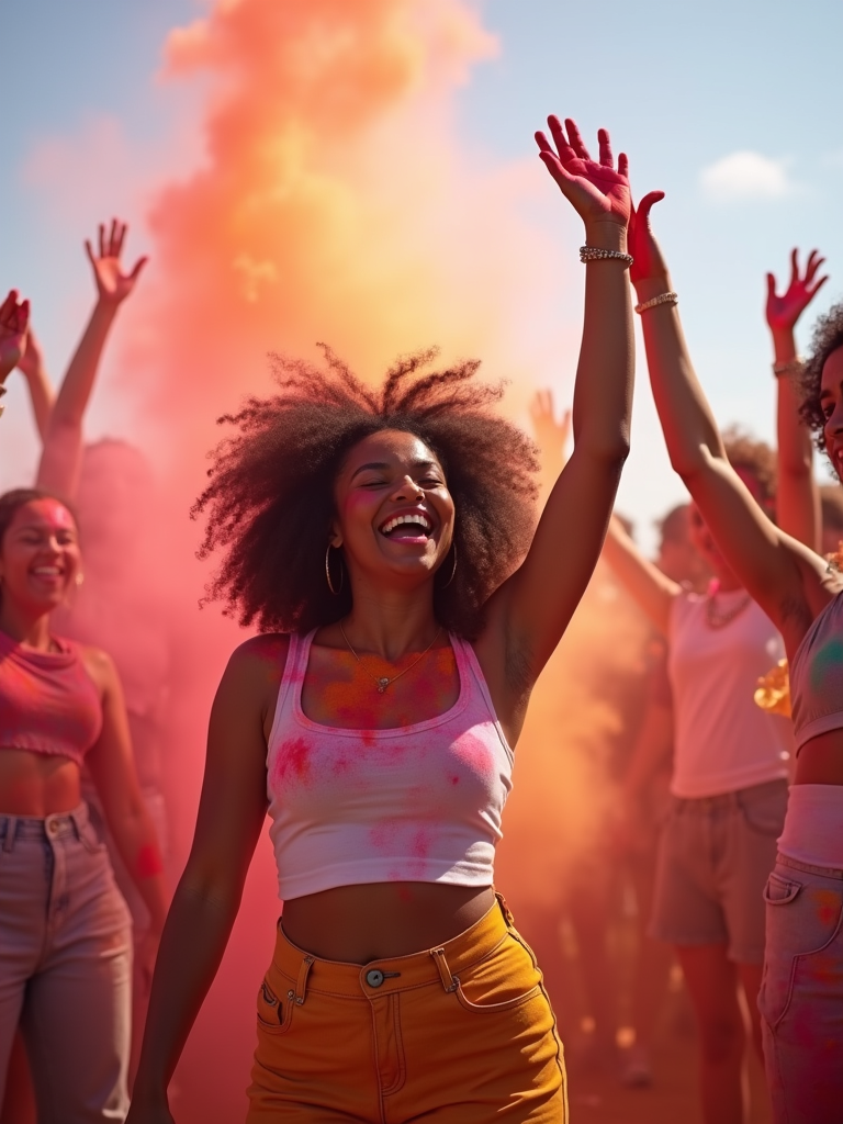 a model enjoying Holi festivities on a sunny day, surrounded by friends throwing gulal powder , raising their hands in celebration with multicolored powder clouds in the air