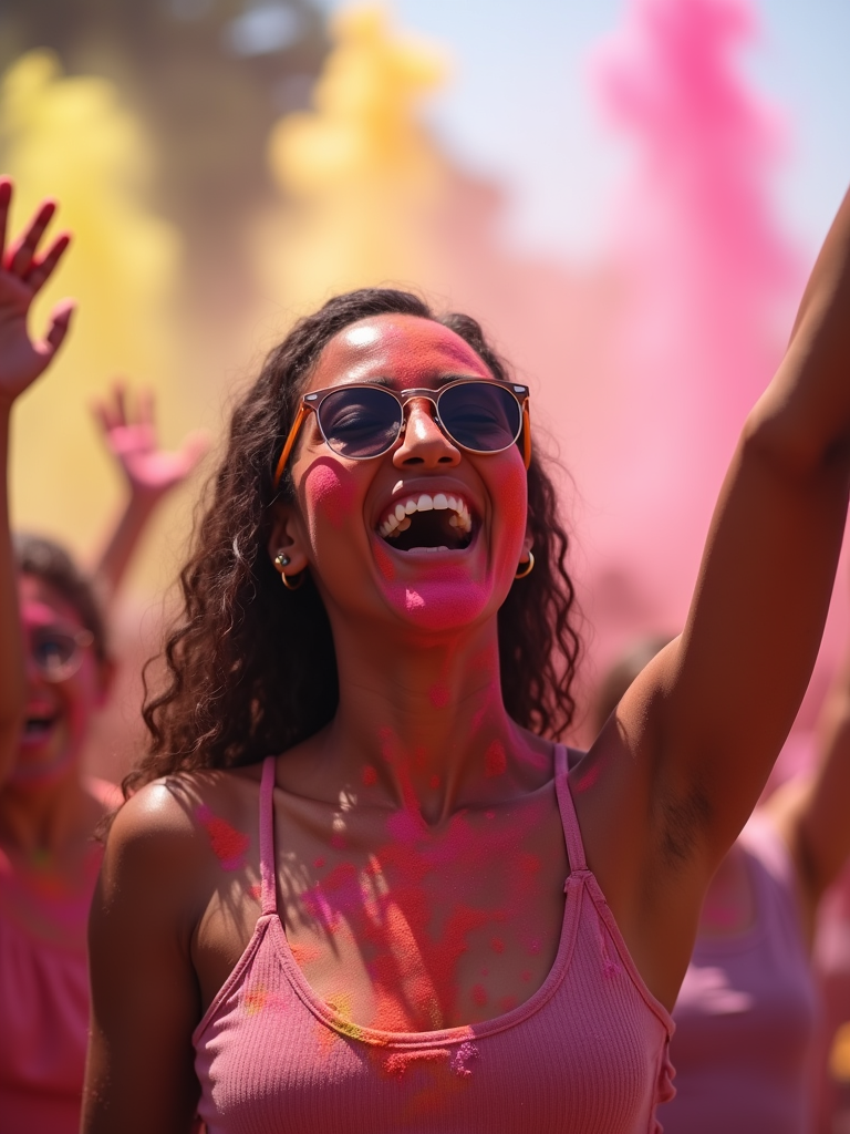 a model enjoying Holi festivities on a sunny day, surrounded by friends throwing gulal powder , raising their hands in celebration with multicolored powder clouds in the air