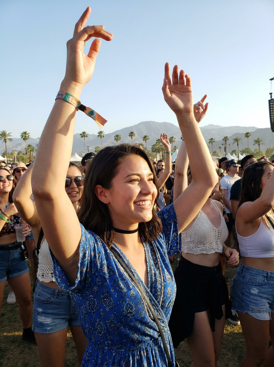 a model enjoying live music on a sunny day at Coachella, surrounded by colorful festival-goers and raising their hands in excitement, with desert mountains in the distance