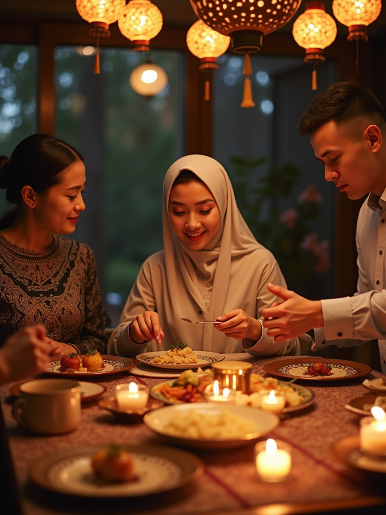 a model enjoying Ramadan festivities in the evening, surrounded by family members preparing iftar , with a table full of traditional foods and sweet treats