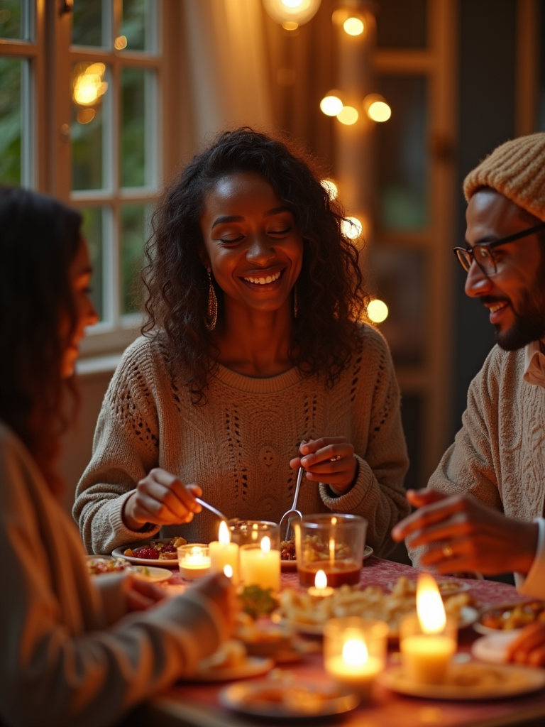 a model enjoying Ramadan festivities in the evening, surrounded by family members preparing iftar , with a table full of traditional foods and sweet treats