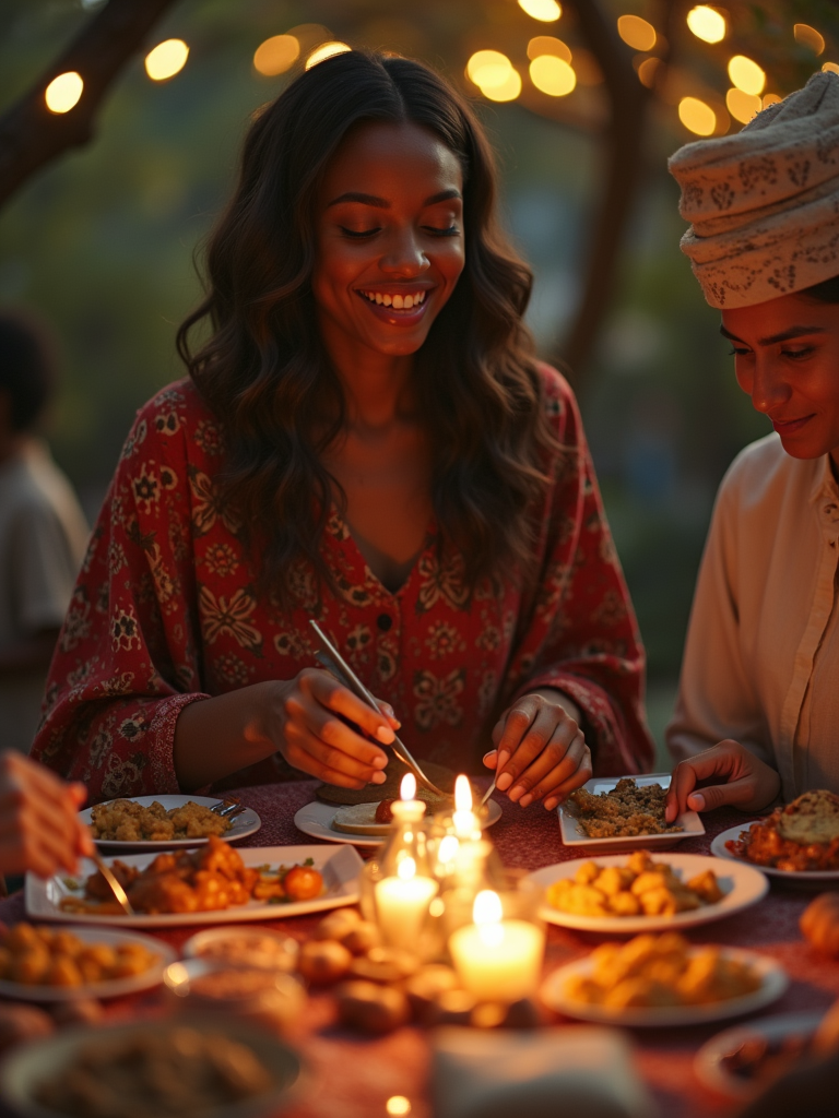 a model enjoying Ramadan festivities in the evening, surrounded by family members preparing iftar , with a table full of traditional foods and sweet treats