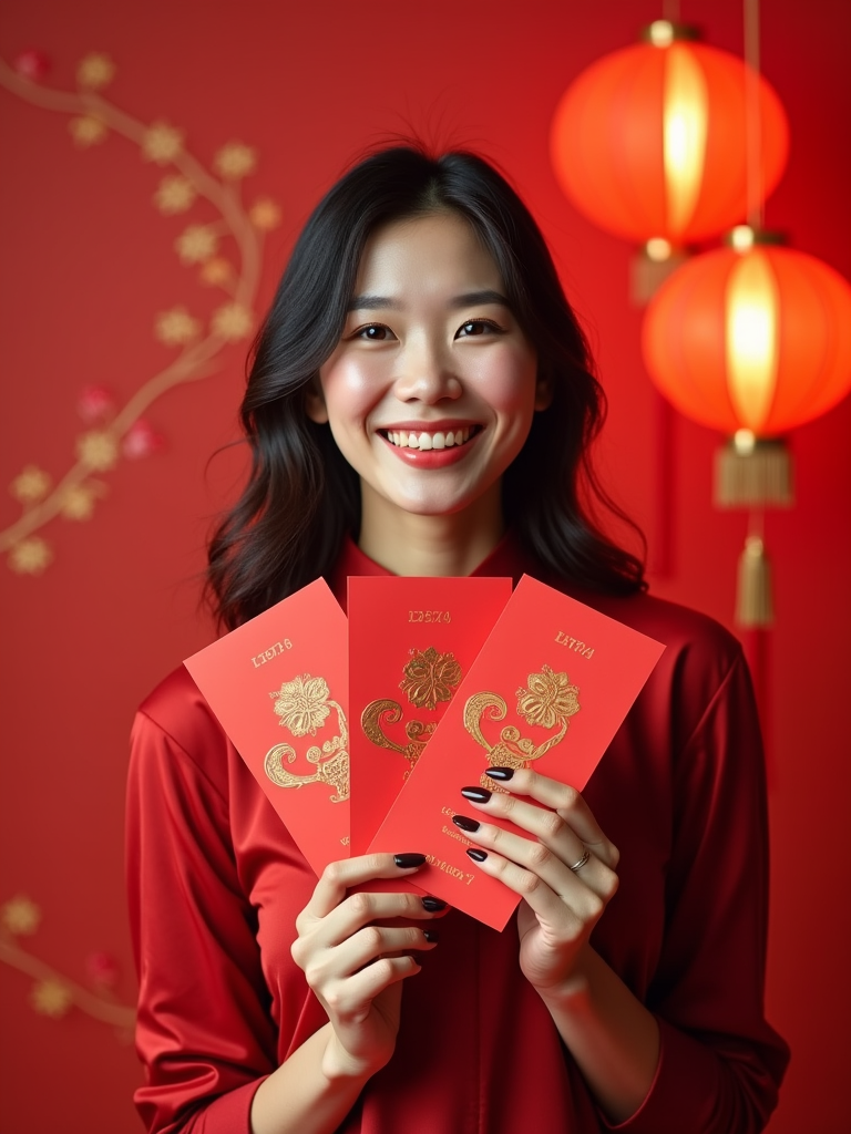 a model enjoying the Chinese New Year atmosphere, with hands holding lucky red envelopes , radiating happiness and prosperity