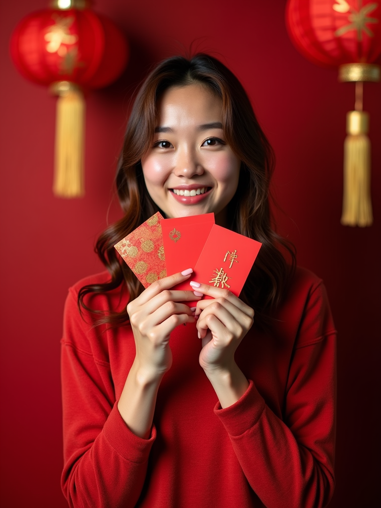 a model enjoying the Chinese New Year atmosphere, with hands holding lucky red envelopes , radiating happiness and prosperity