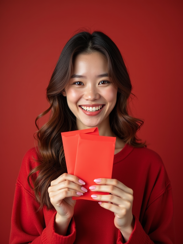 a model enjoying the Chinese New Year atmosphere, with hands holding lucky red envelopes , radiating happiness and prosperity