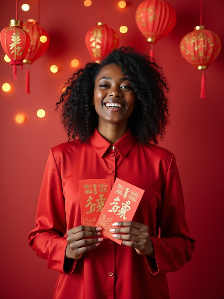 a model enjoying the Chinese New Year atmosphere, with hands holding lucky red envelopes , radiating happiness and prosperity
