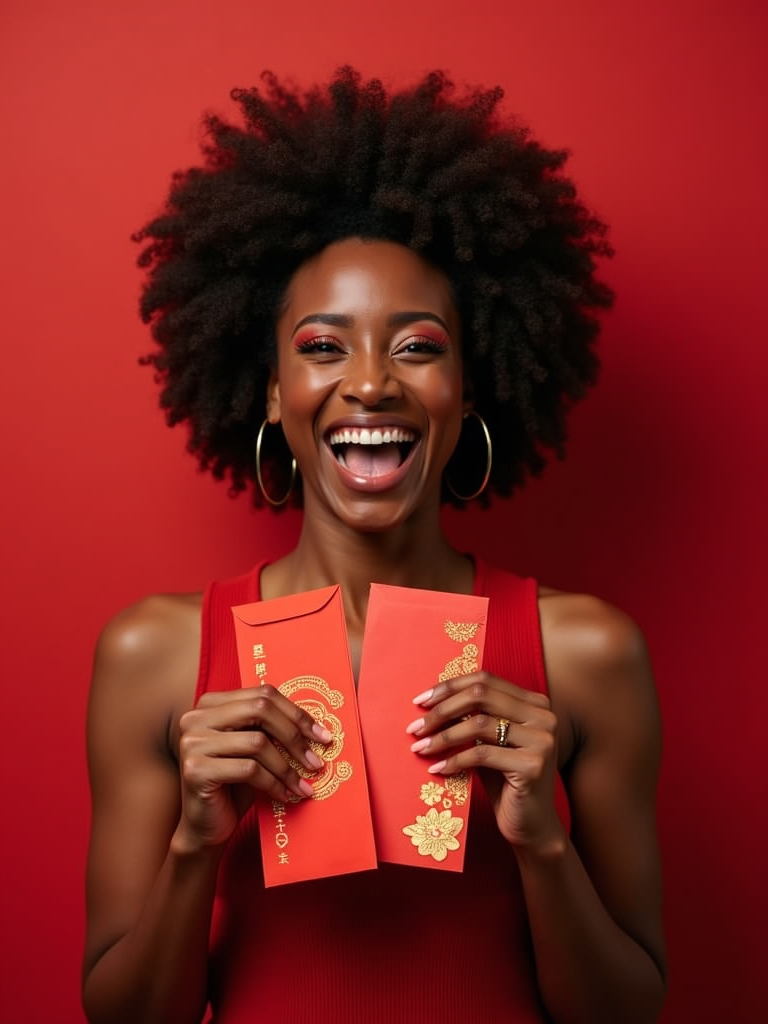 a model enjoying the Chinese New Year atmosphere, with hands holding lucky red envelopes , radiating happiness and prosperity