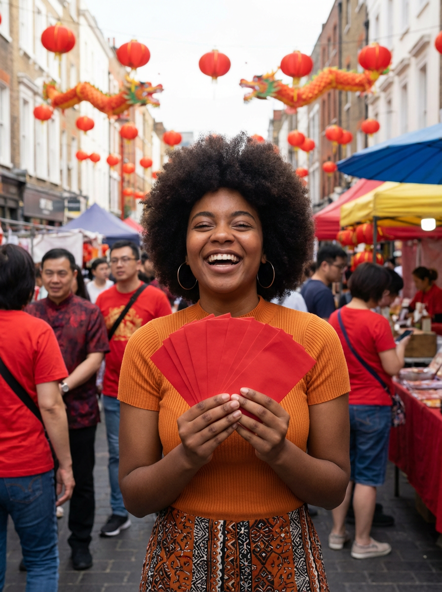 a model enjoying the Chinese New Year atmosphere, with hands holding lucky red envelopes , radiating happiness and prosperity